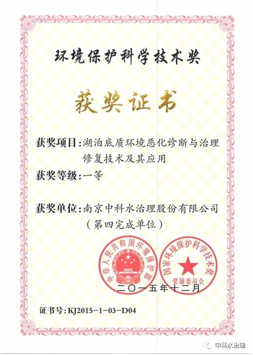 2015年,中科水治理技術(shù)獲得國家環(huán)保部頒發(fā)的環(huán)境保護科學技術(shù)一等獎。