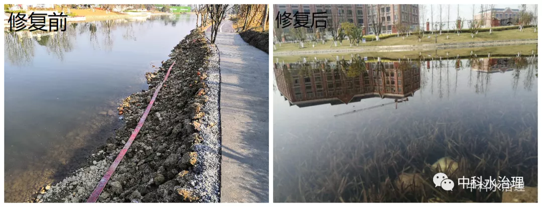 修復后:工程施工結束后,湖面水色正常無異味,水面無藻類、無浮萍、無垃圾、無臭味,水邊能清澈見底,水體透明度≥2.0米已上。水質主要指標(總氮、總磷)含量優于國家《地表水環境質量標準》(GB3838-2002)地表水Ⅲ類標準。