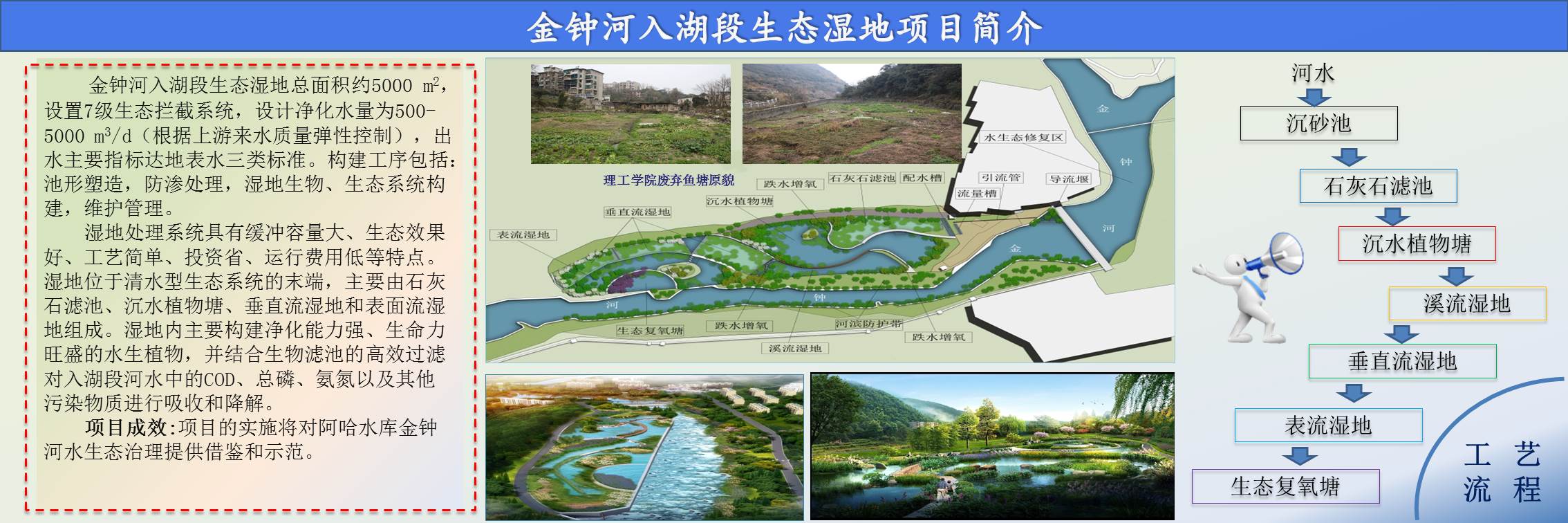 金鐘河入湖段生態(tài)濕地是中科水治理在生態(tài)濕地領(lǐng)域的一大突破,濕地主要由石灰石濾池、沉水植物塘、垂直流濕地和表面流濕地組成,設(shè)計凈化水量為500-5000m3/d,根據(jù)上游來水質(zhì)量,通過引流裝置彈性控制入水量。設(shè)置的7級生態(tài)攔截系統(tǒng),凈化水質(zhì),確保出水主要指標(biāo)達地表水環(huán)境質(zhì)量標(biāo)準(zhǔn)(GB3838-2002)Ⅲ類水標(biāo)準(zhǔn)。